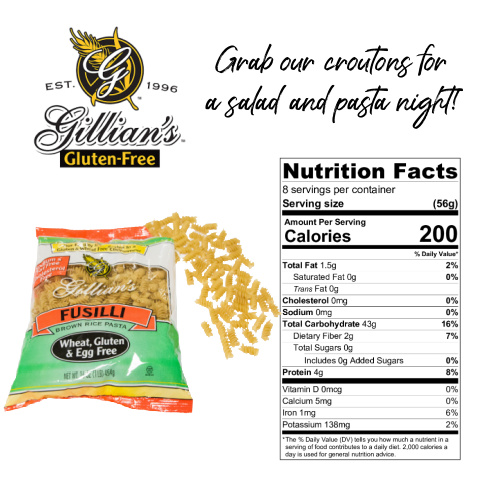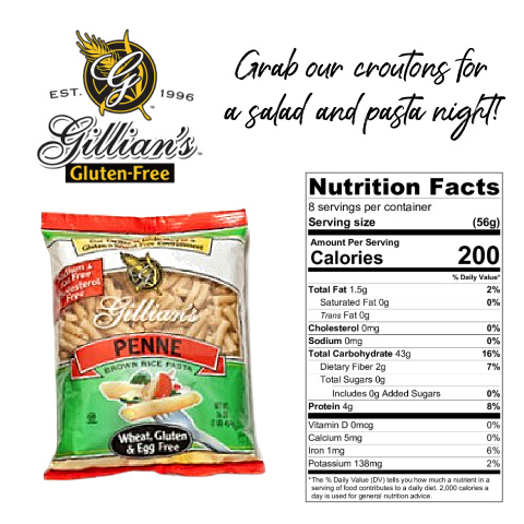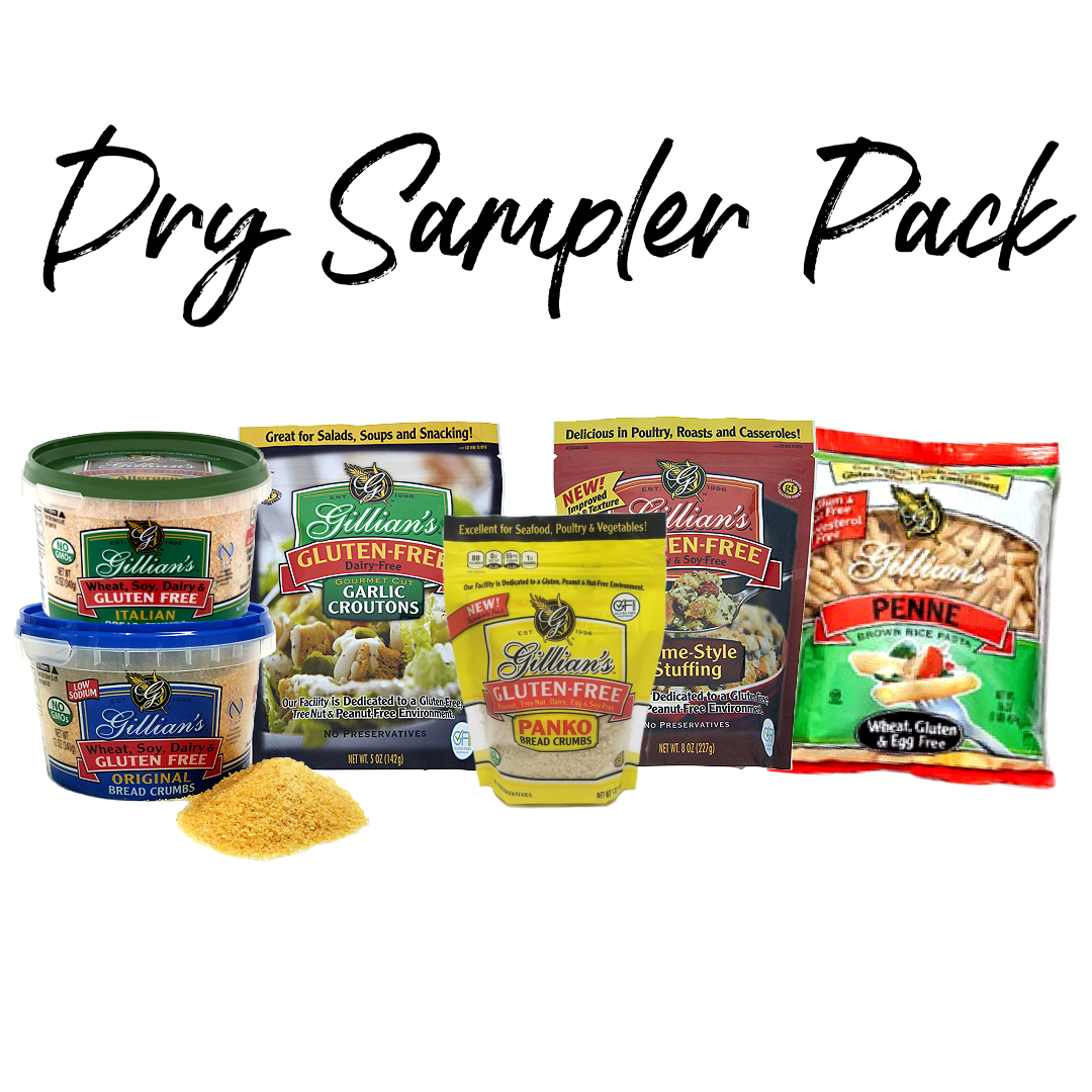Whether your new to Gillian’s Foods or just can’t decide what to get, our dry item sampler lets you have a little bit of everything. This pack includes 2 of each pasta (penne and fusilli), 2 plain breadcrumbs, 2 Italian breadcrumbs, 2 panko style breadcrumbs, 1 crouton, and 1 stuffing. PRIORITY SHIPPING INCLUDED! You’ll receive your package within 3 days from USPS pickup.